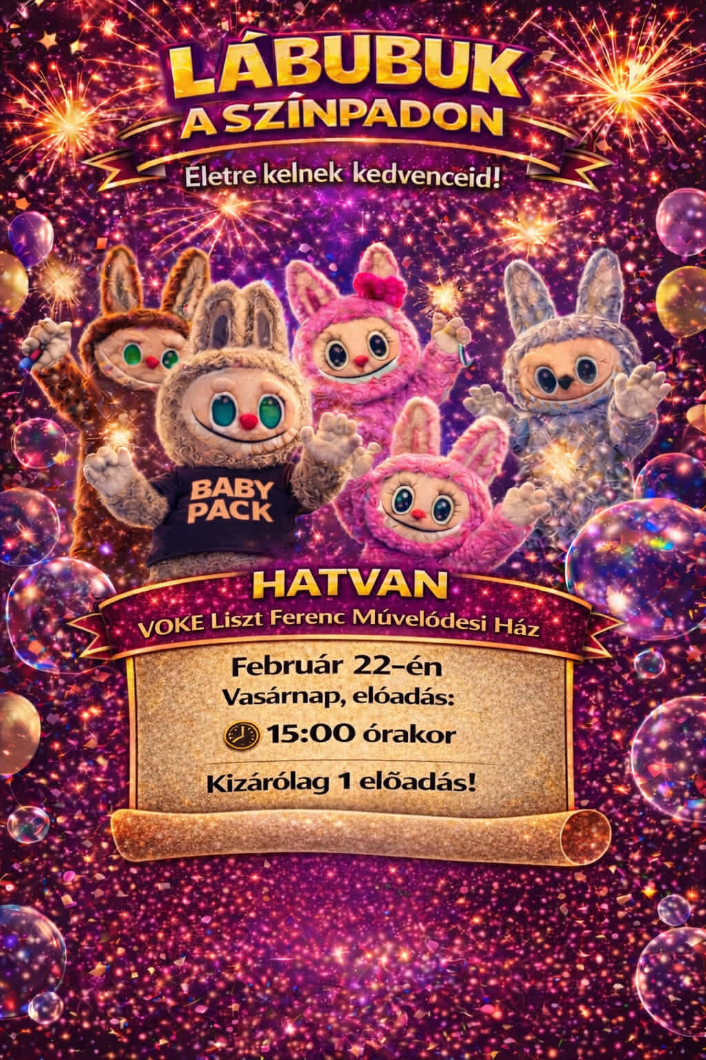 Lábubuk a színpadon 2026. február 22. 15.00Hatvan, Voke Liszt Ferenc Művelődési Ház - DaliJegyek a helyszínen vásárolhatók az előadás előtt.Jegyár: Egységesen 5000 Ft/fő (1 éves kortól)