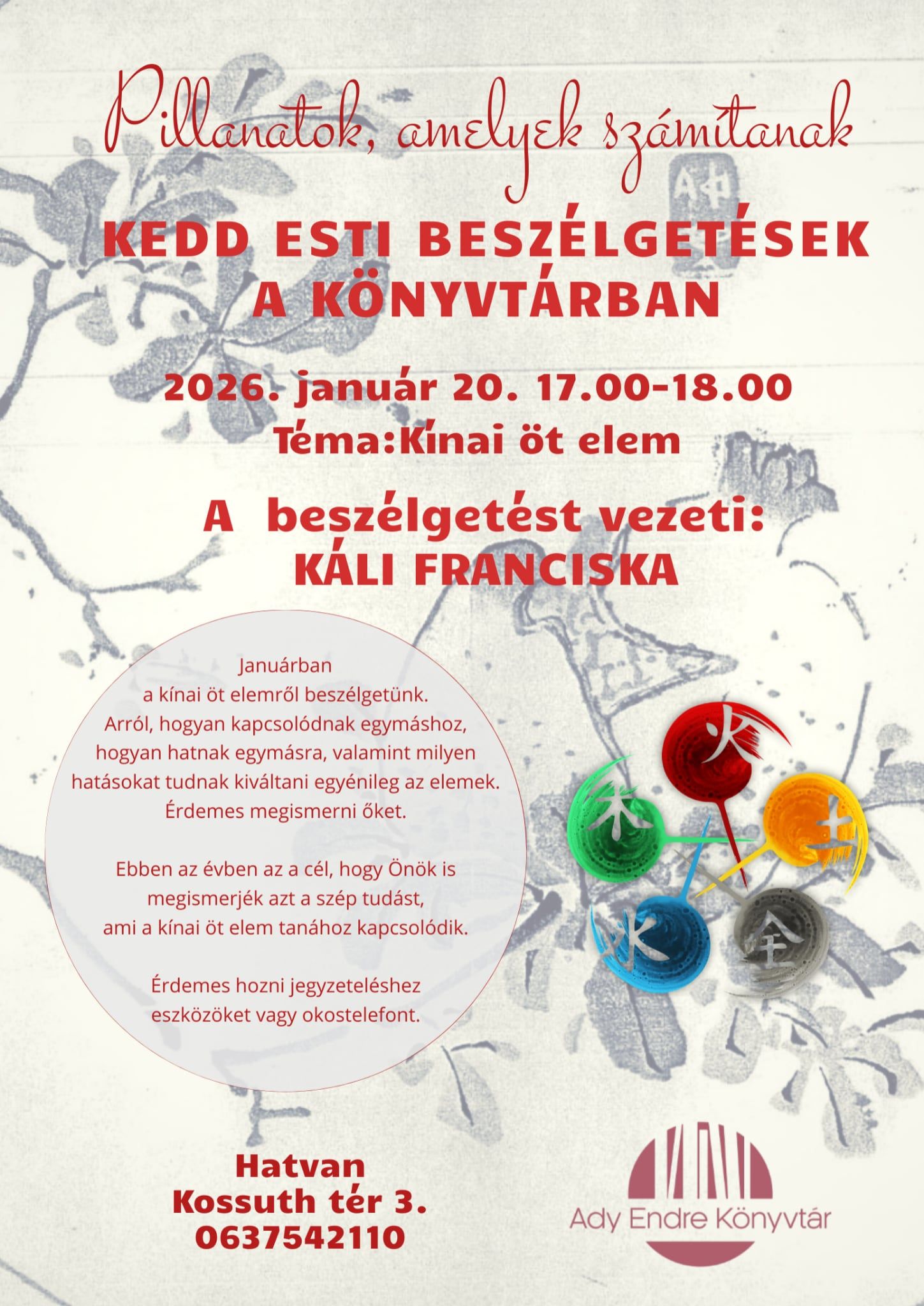 Kedd esti beszélgetések a könyvtárban: Kínai öt elem 2026. január 20. 17.00 Hatvan, Ady Endre Könyvtár